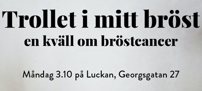 Evenemang av Svenska Kvinnoförbundet i Sörnäs och Luckan Helsingfors Svenska Kvinnoförbundet i Sörnäs i samarbete med Schildts & Söderströms och Luckan bjuder in till en informativ kväll där det viktiga temat bröstcancer diskuteras. Se programmet nedan. Program: Kl. 17.45 Dörrarna öppnas och publiken bjuds på traktering i form av smoothies och smörgåsar. Kl. 18.00Svenska Kvinnoförbundet…