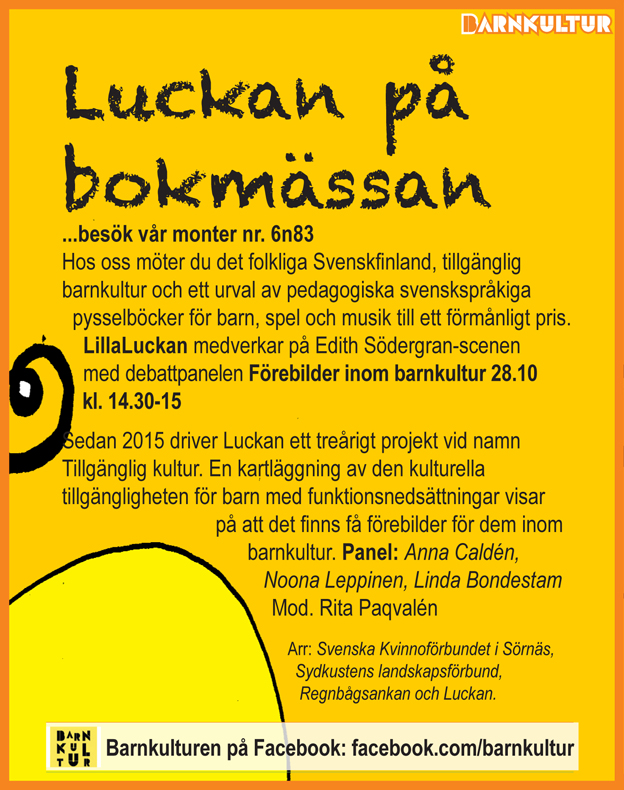 Luckan är på bokmässan 27-30.10.2016! Besök vår monter nr. 6n83. Hos oss möter du det folkliga Svenskfinland, tillgänglig barnkultur och ett urval av svenskspråkiga pysselböcker för barn, spel och musik.