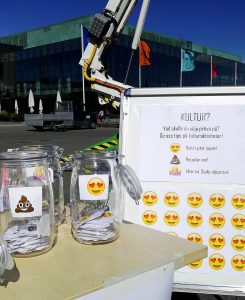 Ungdomsakademin Luckan fanns på plats och höll i trådarna för en programverkstad under denna soliga tisdag i maj. På vår station erbjöd vi ungdomarna möjlighet att rösta med hjälp av olika “emojis” på vilka kulturaktiviteter som de saknar eller vill se mera av i Helsingfors kulturutbud. De fick tre olika emojis som motsvarade tre olika påståenden; “Detta tycker jag om!”, “Nej, gillar inte!” och “Låter kul! Skulle vilja pröva!”. På baksidan av varje emojis skulle de skriva en kulturaktivitet. Vi hjälpte lite på traven genom att vi hade printat ut i olika ramar de nio officiella konstformerna* som finns i Finland och gett lite tips på vilka kulturaktiviteter som kunde höra till dessa konstformer.