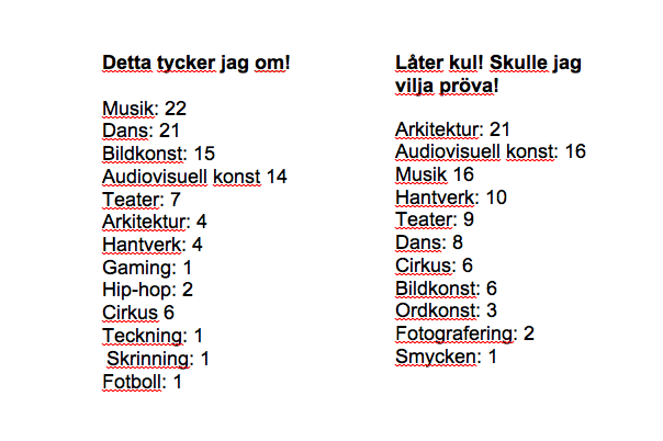 Nu har vi förstås räknat lapparna och kollat vad vi fått för resultat. Resultatet är väl ganska väntat, det är många kulturformer till exempel musik som får ganska jämnt i alla kategorier. Konstformen dans är något som toppar i både kategorin gillar och ogillar.