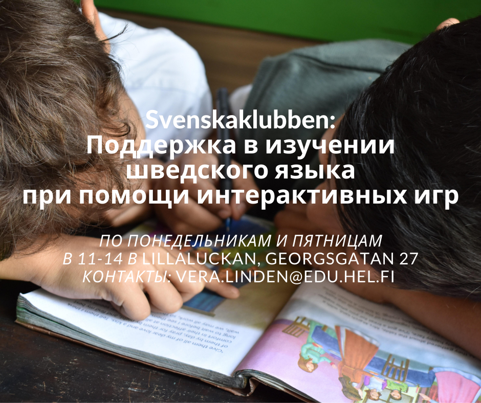 Vi söker också volontärer för att hjälpa med att dra lekar och diskutera med barnen på svenska. Materialet för aktiviteterna erbjuds av den flerspråkiga handledaren från Helsingfors stad som drar verksamheten. Det som behövs av volontärerna är viljan att stödja barnens språkutveckling, en positiv attityd och möjlighet att ställa upp minst en gång per vecka för att skapa en trygg miljö med bekanta vuxna för barnen. Baskunskaper i ryska eller erfarenhet av att leda barngrupper uppskattas, men är inte ett krav